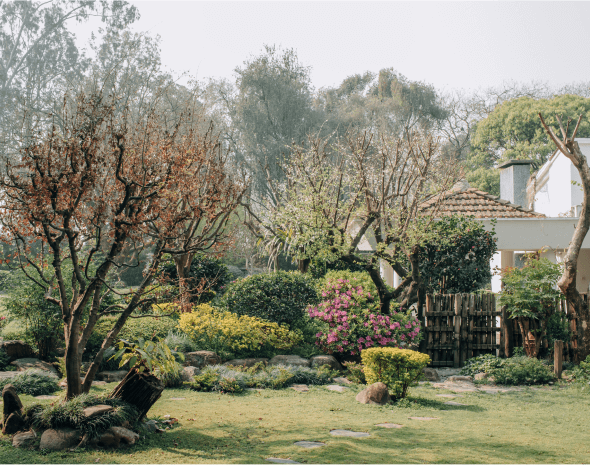 The Momiji Garden is adjacent to the Jacaranda Garden. A type of Japanese maple tree, the Momiji tree in the garden, was brought from Japan more than three decades ago. The beauty of the maple tree is visible in the fall season when the leaves turn deep and dark. The garden also has bougainvillaea, azalea, Chinese rose, cape jasmine, and fuji wisteria blooming through various seasons of the year.